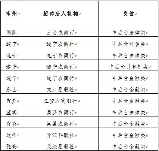 2017年四川省农村信用社社会招聘报名结束后,部分岗位报名通过资格初审人数较少,未达到规定比例。经研究,对部分岗位招聘计划予以调整,现将有关事项公告如下: