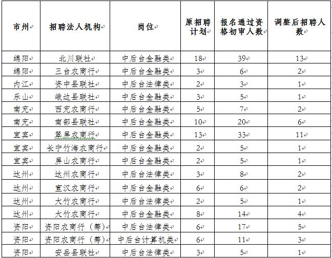 2017年四川省农村信用社社会招聘报名结束后,部分岗位报名通过资格初审人数较少,未达到规定比例。经研究,对部分岗位招聘计划予以调整,现将有关事项公告如下: