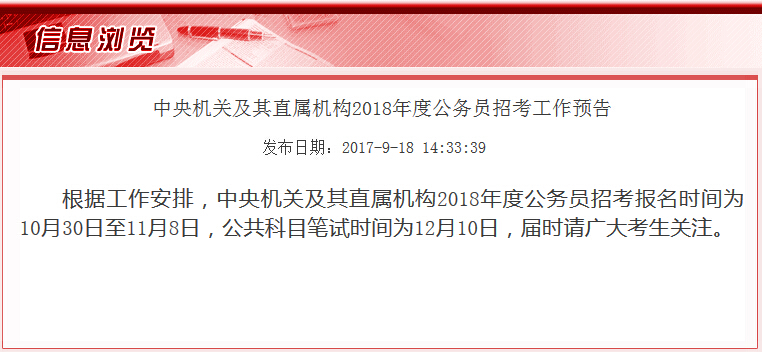 根据工作安排,中央机关及其直属机构2018年度公务员招考报名时间为10月30日至11月8日,公共科目笔试时间为12月10日,届时请广大考生关注。
